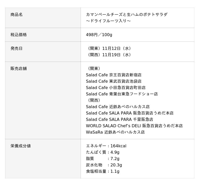 ケンコーマヨネーズ株式会社(所在地:東京都杉並区、代表取締役社長:島本 国一)の100%子会社であるサラダカフェ株式会社(所在地:大阪府吹田市、代表取締役社長:石井 健夫、以下「サラダカフェ」)は、百貨店やショッピングモールを中心に、彩り豊かなサラダや総菜を販売するサラダショップを展開しています。11月20日(木)のボジョレー・ヌーヴォー解禁に向け、ワインにぴったりなメニューとして、関東店舗では11月12日(水)、関西店舗では11月19日(水)発売の「カマンベールと生ハムのポテトサラダ~ドライフルーツ入り~」と、11月19日(水)発売の「ワインと楽しむ4種アンティパスト」をご紹介します。