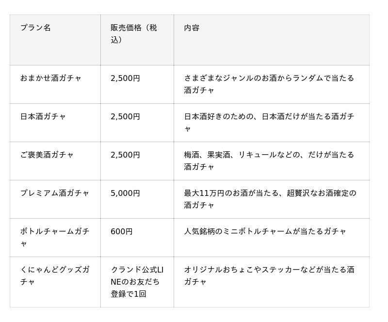 当たるお酒のラインアップには1本110,000円(税込)の、50年熟成酒粕焼酎「神響 shinkyo 50年」や、1本55,000円(税込)の30年熟成させた日本酒「天琥 -tenko- 30年」など、一般販売していないレアなお酒も入ります。他にもクランド公式LINEを友だち登録すると回せる、「くにゃんどグッズガチャ」も登場します。