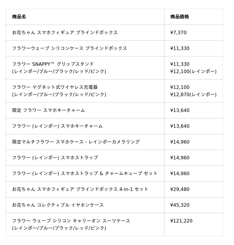 さらにコレクター向けには、「お花ちゃん スマホフィギュア ブラインドボックス」も登場。ボックスには、小さなお花ちゃん スマホフィギュアが1つ入っており、スマホケースやデバイスに取り付けが可能です。色は、レインボー、ピンク、ブルー、レッド、ブラックのいずれか1色がランダムで入っています。