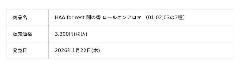 2026年1月22日より、公式オンライストアや全国のお取り扱い店舗より、順次発売いたします。ぜひ、お手にとって「HAA for rest 間の香」の深呼吸する香りをお試しください。