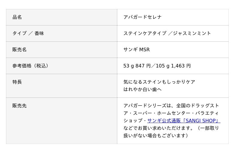 アパガードは、歯とほぼ同じ成分*2である「ハイドロキシアパタイト」を歯みがき剤に配合するという“歯に成分を与える”足し算の発想から誕生しました。サンギの歯みがき剤には、むし歯予防の有効成分「薬用ハイドロキシアパタイト」が配合されており、「アパガードセレナ」ではさらに2種のステインケア成分*3を加えています。