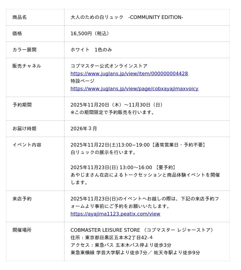 Cobmaster×あやじま×Voicy 初のコラボレーション"ミニマリストと作った 大人のための白リュック"をコブマスター公式オンラインで発売