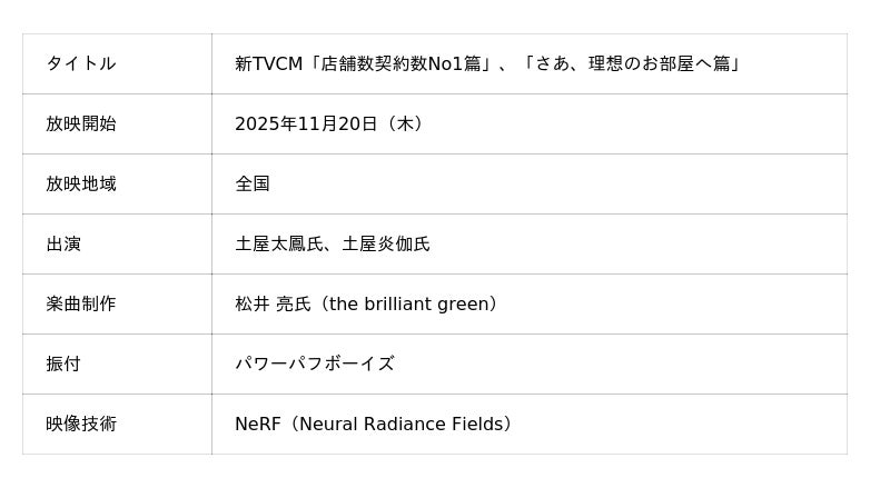 CMには、土屋太鳳氏・土屋炎伽氏の、飾らない魅力と信頼感を兼ね備えた姉妹が出演。今回のCMは、最新のAI映像技術「NeRF」と、軽快な音楽・振付を融合させることで、お部屋探しから始まる「新しい暮らしへの期待感」を、視聴者の心に残る躍動感と清潔感で表現しています。