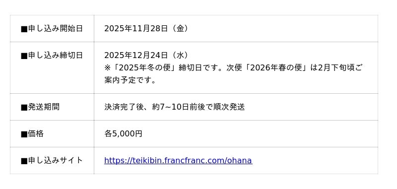 ライフスタイルを提案するインテリアブランド『Francfranc(フランフラン)』は、2025年9月から開始した公式オンラインショップの定期便サービス「Find My Style暮らしの彩り定期便」の第二弾「お花のある暮らし便」を2025年11月28日(金)より開始します。