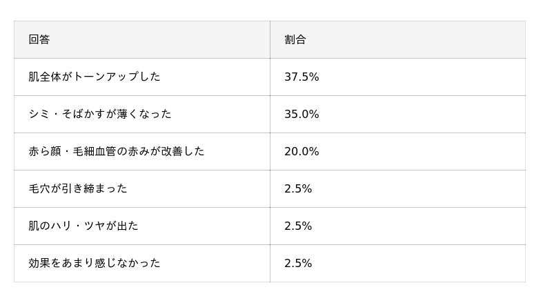 最も多かった効果の回答は「肌全体がトーンアップした」で、37.5%を占めました。これに続いて「シミ・そばかすが薄くなった」と答えた人も同程度の割合となっており、ルメッカは肌全体の明るさや色むら改善に寄与していることがうかがえます。