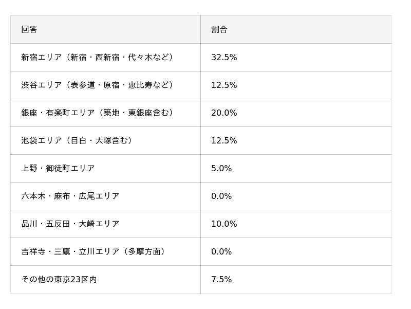 施術を受けたクリニックの場所では、「新宿エリア(新宿・西新宿・代々木など)」と回答した人が最も多い結果となりました。クリニックを選ぶ際は、エリアの利便性や通いやすさも踏まえて検討すると良いでしょう。
