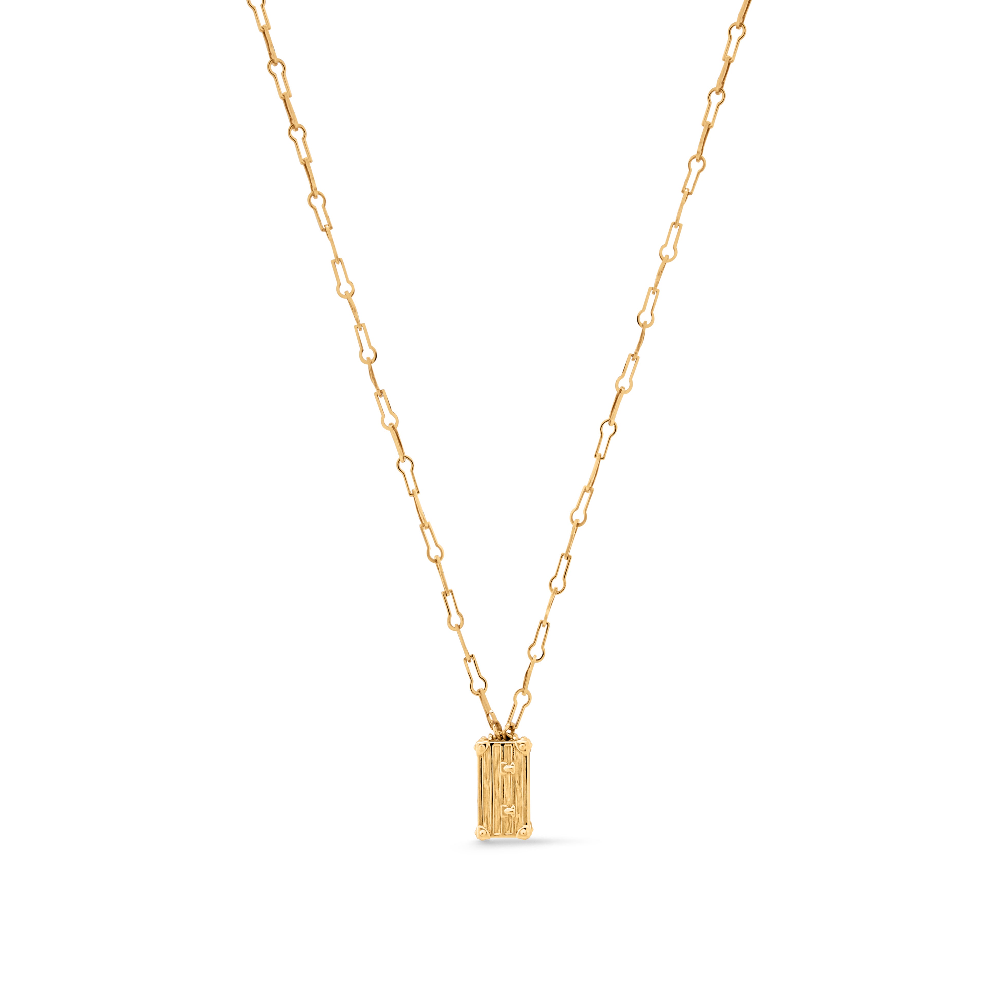 印象的なデザインの「ネックレス・LV トランク」。メゾンのトランク製造の歴史を現代的な感性で表現しました。ゴールドカラーでキーホールの形を連ねたリンクチェーンに吊り下げられた精緻なペンダントは、ヴィンテージスタイルのルイ・ヴィトン トランクを象徴しています。旅の真髄(こころ)と冒険のエスプリを宿す、お守りのように身に着けたいエレガントなネックレス。