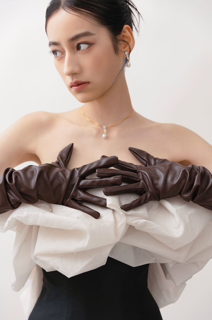 ナチュラルなシワ感のあるボリュームタッキングの胸もとの飾りは、小さなパールが1粒1粒手付けされたもの。