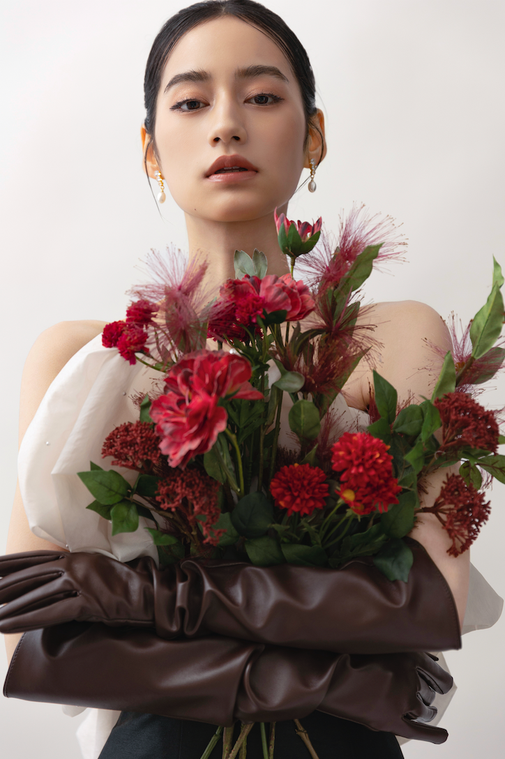 アクセントとなるレザーグローブや赤いブーケで秋冬らしい雰囲気に。