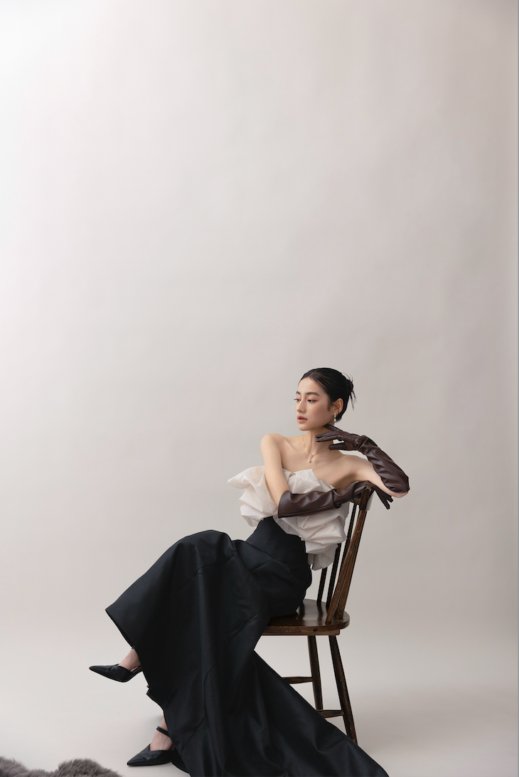 2025AWトレンドを感じるファッション広告のような雰囲気で。