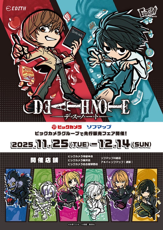 IPを活用したイベント事業・グッズ事業を手掛ける株式会社イーディス(本社:東京都豊島区、代表取締役:森俊平、以下イーディス)は、「DEATH NOTE」の原作イラスト、描き起こしデフォルメイラストを使用したグッズがビックカメラグループにて先行販売決定いたします。