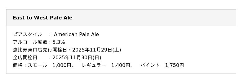 株式会社ワンダーテーブル(本社:東京都新宿区西新宿、代表取締役社長:河野 博明)は、よなよなエール公式ビアレストラン『よなよなビアワークス』にて、株式会社CRAFT BEER BASEと株式会社ヤッホーブルーイングのコラボレーションビール「East to West Pale Ale」を、2025年11月29日(土)に恵比寿東口店で先行提供します。当日は両ブルワーによる無料トークセッション(事前予約制)も実施。翌30日(日)からは全店で提供を開始します。