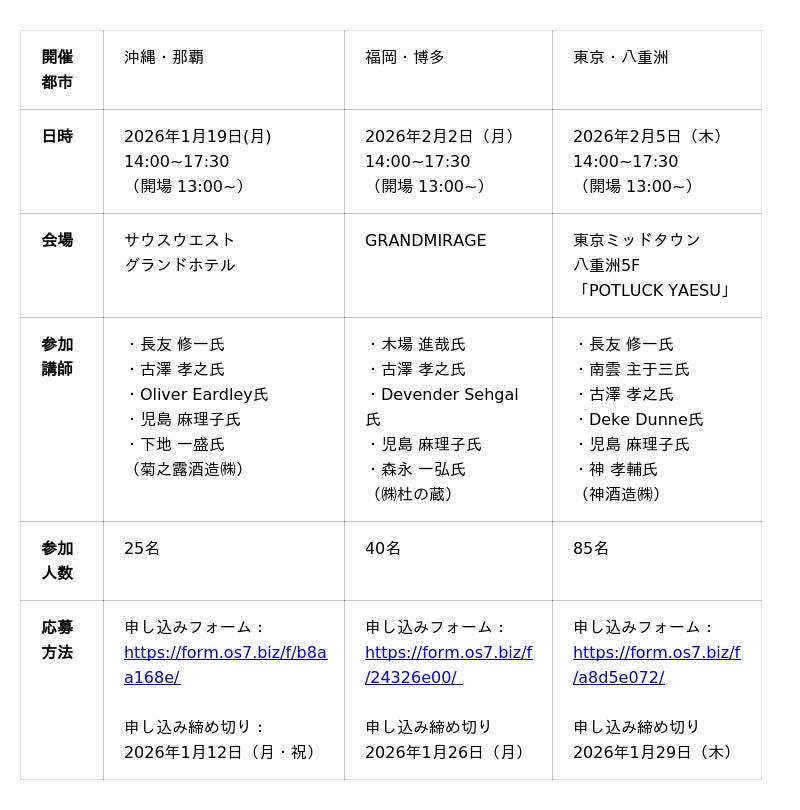 全国約1,600の蔵元(本格焼酎・泡盛、日本酒、本みりん)が所属する日本産酒類最大の団体である日本酒造組合中央会は、2026年1月19日(月)を皮切りに、日本国内3都市(沖縄・那覇/福岡・博多/東京・八重洲)にて、バーテンダーを対象としたセミナー「The SHOCHU NAVIGATION」を順次開催いたします。国内バーテンダー向け本格焼酎・泡盛マスタークラスとしての施策実施は本会初となります。