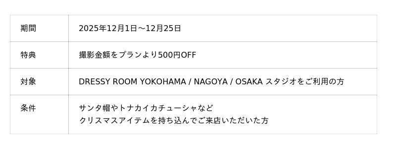 セルフ写真館 PICmiiは、カメラ専門店「カメラのキタムラ」のグループ会社として、撮影画質の仕上がりにこだわったセルフ写真館で、個室での自由な撮影をお楽しみいただけます。DRESSY ROOM YOKOHAMA / NAGOYA /OSAKA スタジオでは、12月限定で『クリスマス割』を実施。12/1~12/25の期間、サンタ帽やトナカイカチューシャなどクリスマスアイテムを持ち込んでご来店いただくとご利用料金より500円OFFとさせていただきます。 (記事を見た旨をお伝え下さい。)