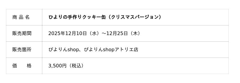 ジェイアール東海フードサービス株式会社(本社:愛知県名古屋市、代表取締役社長:岩下賢一)は、オリジナルスイーツ「ぴよりん」をモチーフにした「ひよりの手作りクッキー缶」のクリスマスバージョンを、2025年12月10日(水)より販売します。クッキーは、ぴよりんの形のメープルクッキーや雪の結晶、ツリーの形など、クリスマスを感じられる8種類をひとつひとつ手作りで詰め合わせました。贈り物にもぴったりの、華やかで特別なクリスマス限定缶です。
