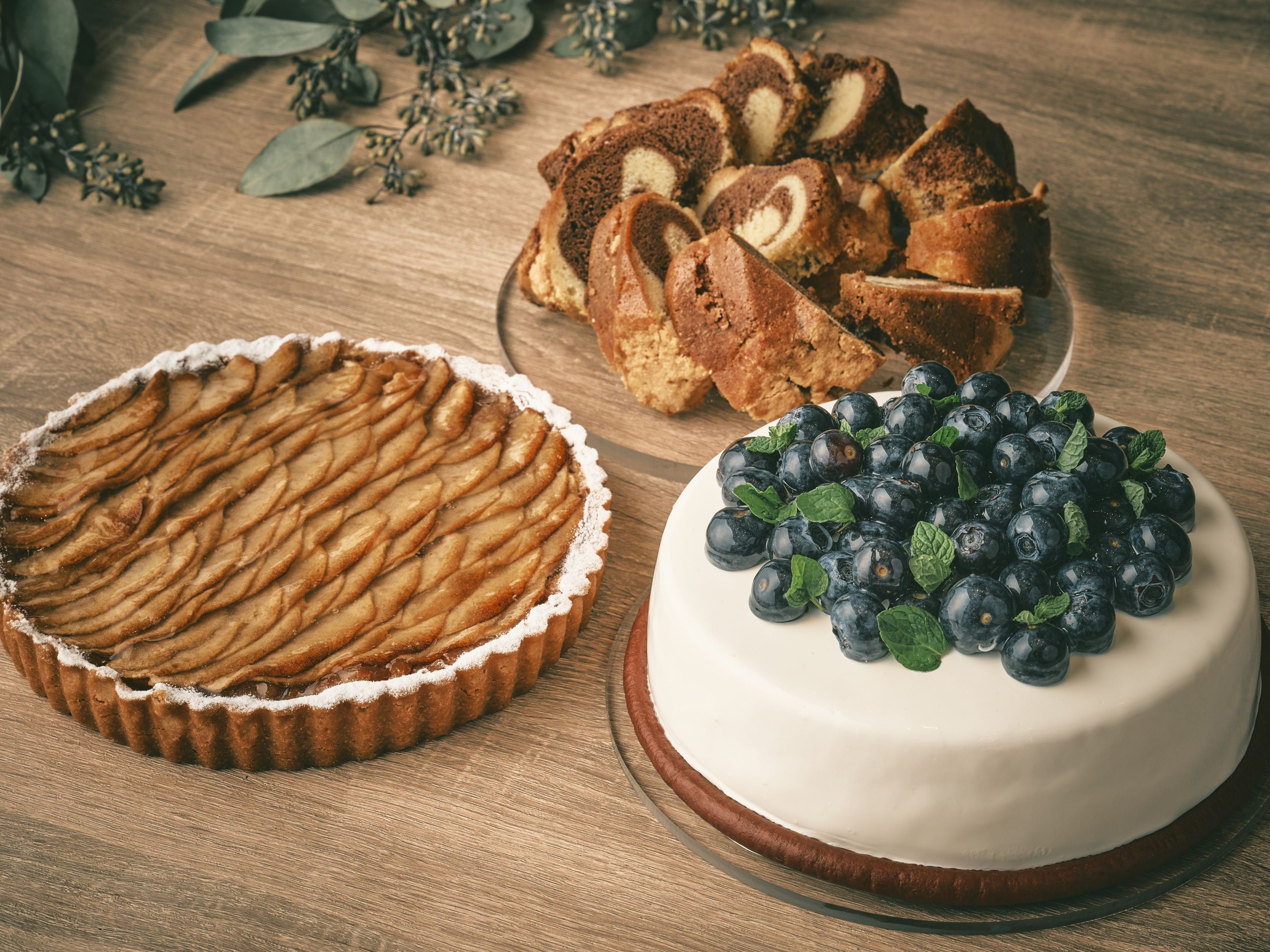 林檎とシナモンピーカンナッツのタルト(左)/マーブルパウンドケーキ(奥)/ブルーベリームース(手前右