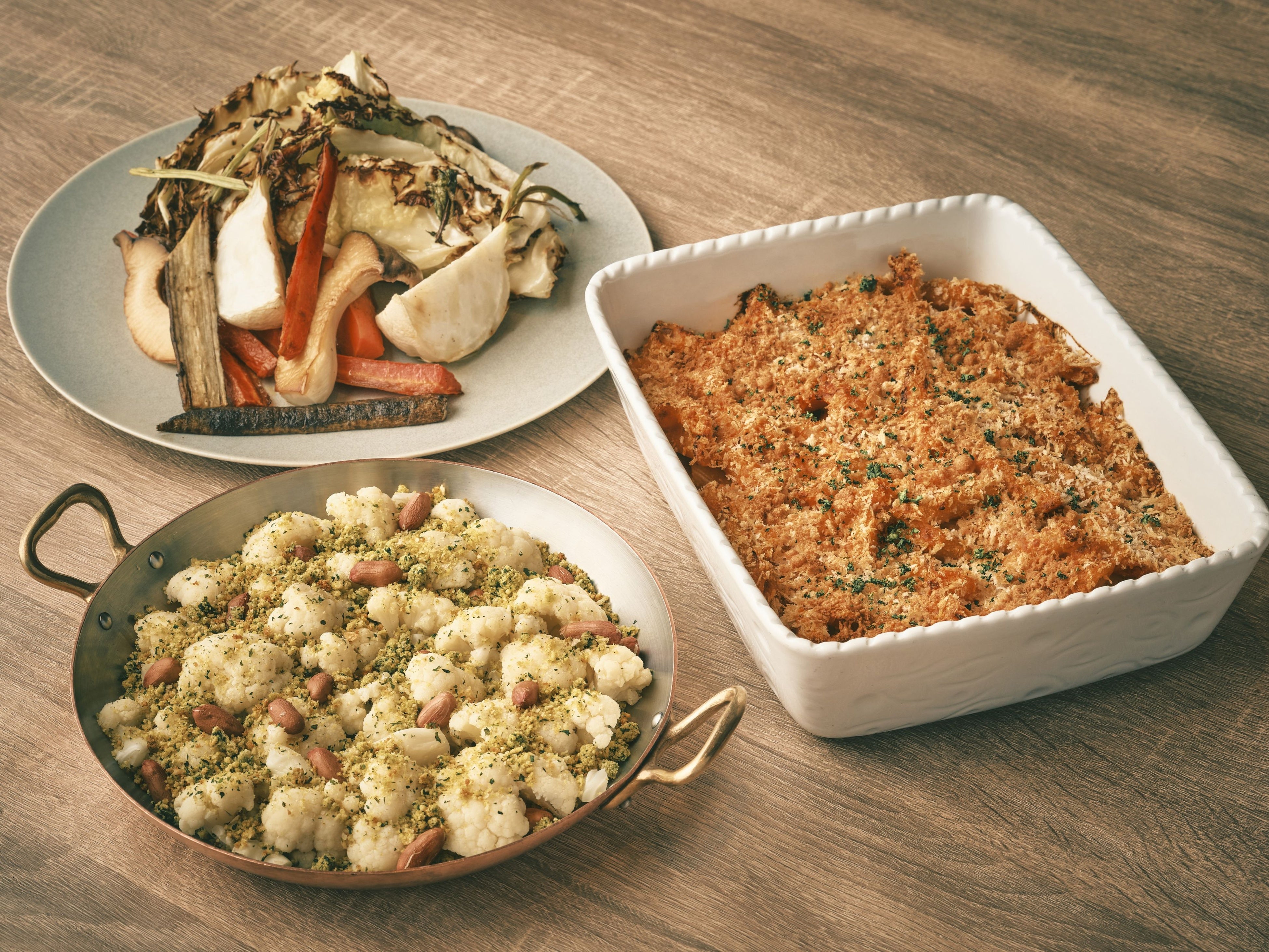 ちりめんキャベツ、カブ、ごぼう、エリンギ、ニンジンのロースト(奥)クリーミーベイクドパスタ パスタアルフォルノ(右)/カリフラワーと落花生のスパイスパン粉焼き(手前)