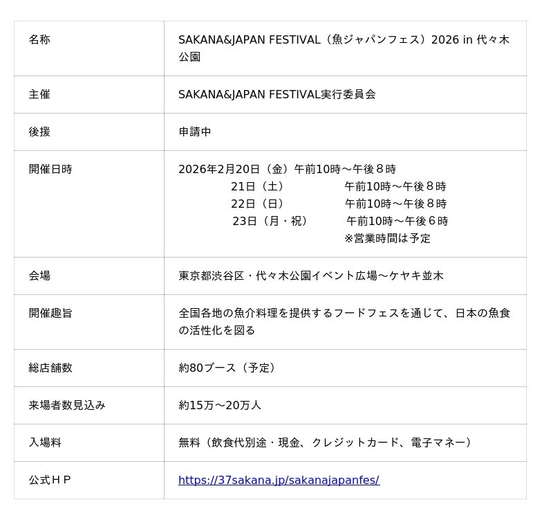 全国各地の魚介グルメが堪能できる「SAKANA&JAPAN FESTIVAL(魚ジャパンフェス)2026 in 代々木公園」(主催・SAKANA&JAPAN FESTIVAL実行委員会)が2026年2月20日(金)~23日(月・祝)の4日間、東京都渋谷区の代々木公園イベント広場~ケヤキ並木で開催されます。