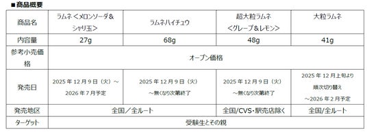 森永製菓株式会社(東京都港区芝浦、代表取締役社長 COO・森 信也)は、「森永ラムネ」ブランドから「ラムネ<メロンソーダ&シャリ玉>」「ラムネハイチュウ」「超大粒ラムネ<グレープ&レモン>」を2025年12月9日(火)より新発売いたします。