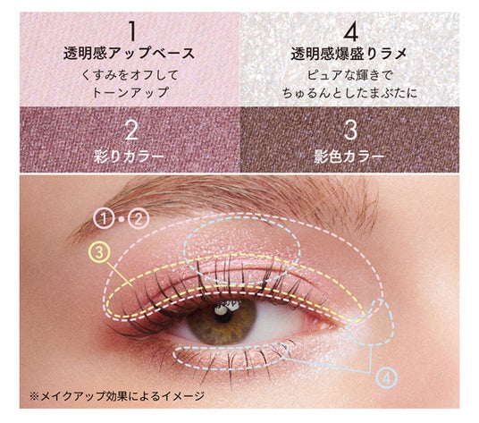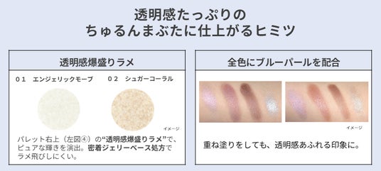 “透明感爆盛りラメ”を含む4つの質感に加え、全色にブルーパールを配合した特別仕様で、重ねるだけで“ちゅるん”とした透明感あふれる大きな目もとを演出します。