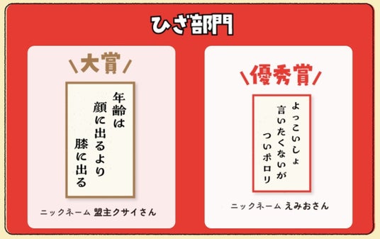 一般投票と当社の厳正な審査の結果、【ひざ部門】大賞1句、優秀賞1句、エイジング賞3句、【ウェルエイジング部門】大賞1句、優秀賞1句、エイジング賞3句の計10作品を選出しました。【ひざ部門】