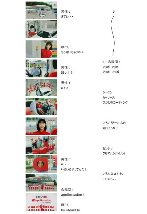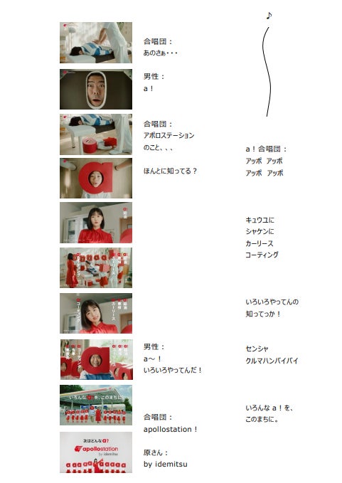 今回の新TVCMでは前シリーズに引き続き、原さんと、apollostationの「a」の赤いかぶり物を身に着けた10名の子どもたちで構成される「a!合唱団」が登場。apollostationでの給油後に帰ろうとしたお客さま、またはマッサージ店で施術中のお客さまを、どこからともなくやって来た原さんたちが取り囲み、歌って踊りながら「いろいろやってんの知ってっか!」と迫ってくる2タイプのストーリーです。お客さまに“a!(あ!)”という驚きや、“a!(あ!)”ってよかったという安心感を提供するapollostationのメッセージを訴求していきます。