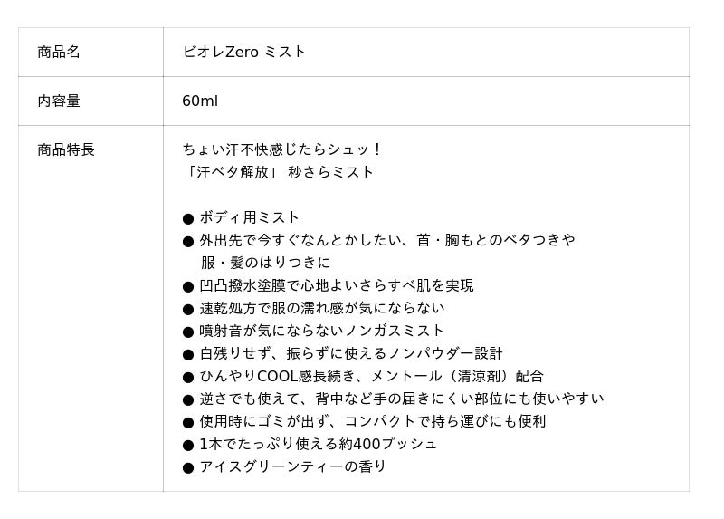 『ビオレZero ミスト』は、シュッとひと吹きした瞬間に肌上の汗を瞬時に薄く広げて蒸散させ、肌をさらさらに整えます。さらに、花王独自技術の凹凸撥水塗膜を形成することで、再びかいた汗をはじき、ベタつきによる不快感を軽減します。また、清涼剤(メントール)を配合し、ひんやり感が長時間持続します。https://www.youtube.com/watch?v=8JLDLHHknM8