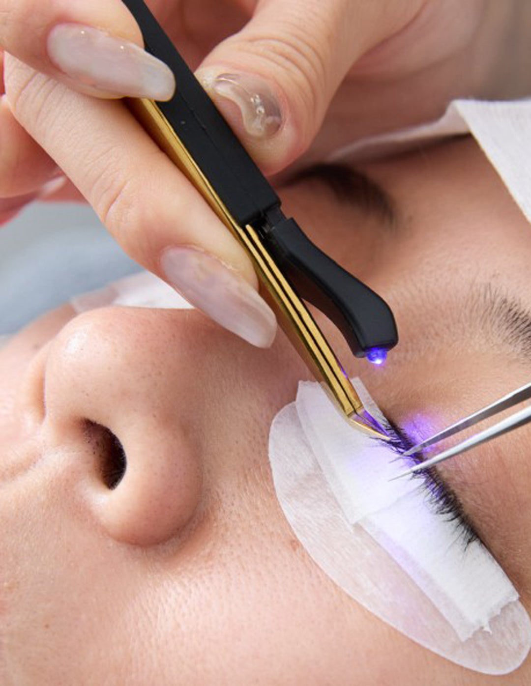 専用のLEDライトで硬化させるグルー(接着剤)を使用して、自まつ毛にエクステンションを装着する最新の技術です。