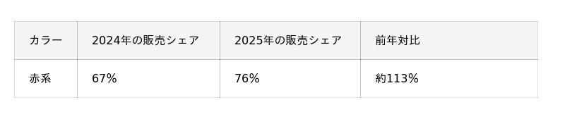 不安定な世の中を生き抜くため、健康志向や癒しを求める傾向が続く一方で、2025年後半から大阪・関西万博開催や日本初の女性総理誕生など、社会に「動き」が出てきたことを背景に、人々の気持ちを牽引する「動」のイメージが強い暖色系が注目されています。特に、高彩度のレッドや、レッドよりも穏やかで親しみやすい紫みのピンク(パープリッシュレッド)がトレンドカラーパレットで増加傾向にあります。(参考/一般社団法人日本流行色協会/JAFCA)■世相を反映!クリスマスギフトはレッド系が約8割に増加