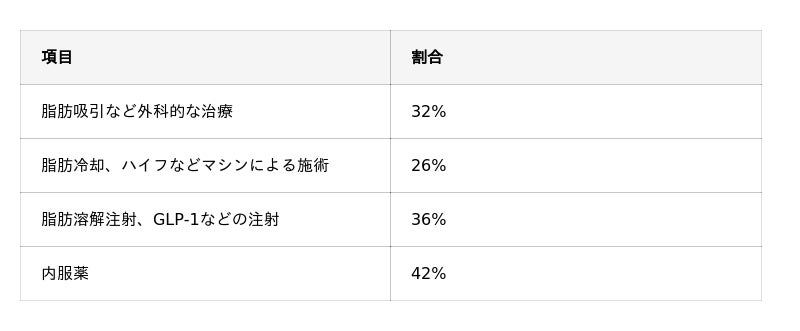 受けた医療ダイエット施術の種類の回答で最も多かったのは、「内服薬」で42%に達しました。