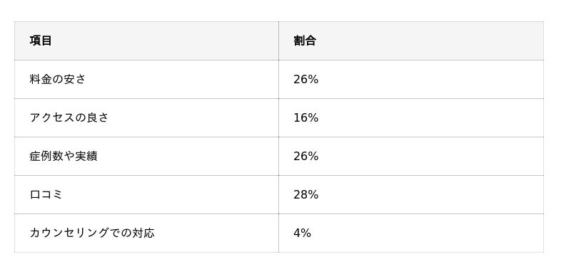 一方で、症例数・実績や費用の妥当性を基準にした人も少なくなく、利用者が「価格と効果のバランス」を重視している傾向がうかがえます。