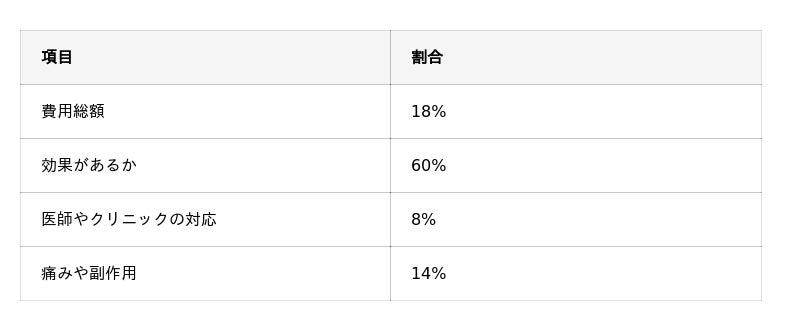 この結果から、医療ダイエットにおいては“確実に成果が見込めるか”を重視する利用者が多いことが読み取れます。