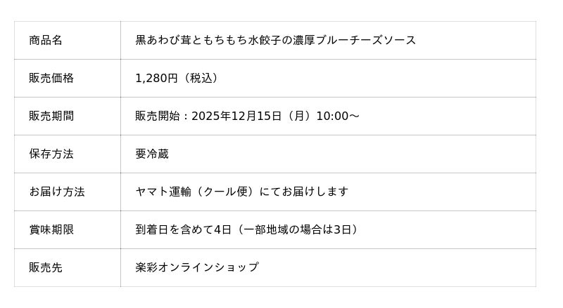 d130004-118-63e4bb678808f00c97fc18f5d0b330b5.pdf 楽彩株式会社(本社:東京都足立区/代表取締役社長:大崎善保)は、2025年12月15日(月)より、最新ミールキット『黒あわび茸ともちもち水餃子の濃厚ブルーチーズソース』を販売開始いたします。RAKUSAIの最大の特徴は、年末年始も休まず24時間365日稼働する「完全受注製造」体制です。ご注文ごとに新鮮なカット野菜をセットするため、作り置きでは味わえない鮮度を実現しました。冬の特別なひとときに、工場直送のフレッシュな美味しさをお届けいたします。
