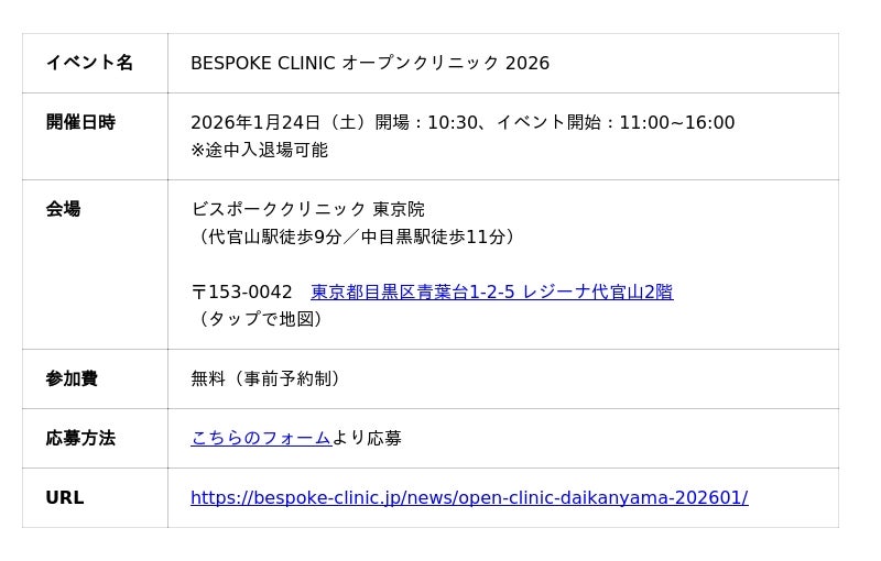 医療法人社団BESPOKE(ビスポーククリニック/東京院:東京都目黒区青葉台1丁目2−5)は2026年1月24日、「BESPOKE CLINIC オープンクリニック2026」を東京院で開催します。
