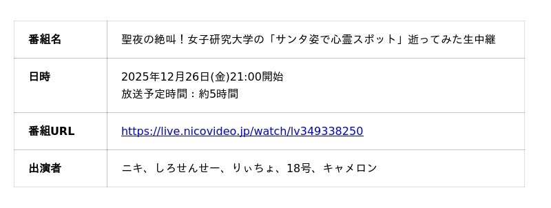 聖夜の余韻も冷めやらぬ週末の深夜に、サンタクロースに扮したメンバーが心霊スポットを巡礼する模様を生放送でお届けする。