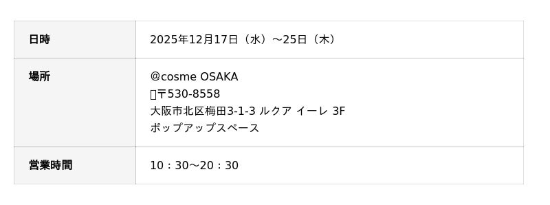 @cosme OSAKAにて、2025/12/17(水)~12/25(木)開催。11月にリニューアルしたスキンケアや人気のリップセラム、導入美容液のSAITAIなど、是非ご体感ください。