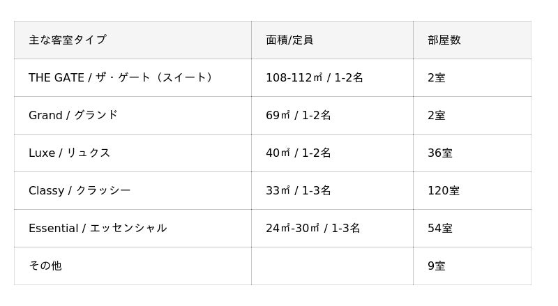 25階にある2つのスイートルーム「THE GATE (ザ・ゲート) 」(108-112平方メートル )は地上100mを超える高さにあり、天空での寛ぎの体験をご提供いたします。主力客室となる「Classy(クラッシー)」(33平方メートル )は、2つの洗面台を設置した豊かな水周り、窓辺にソファーなどを配置し、ゆったりと寛げる空間となっています。