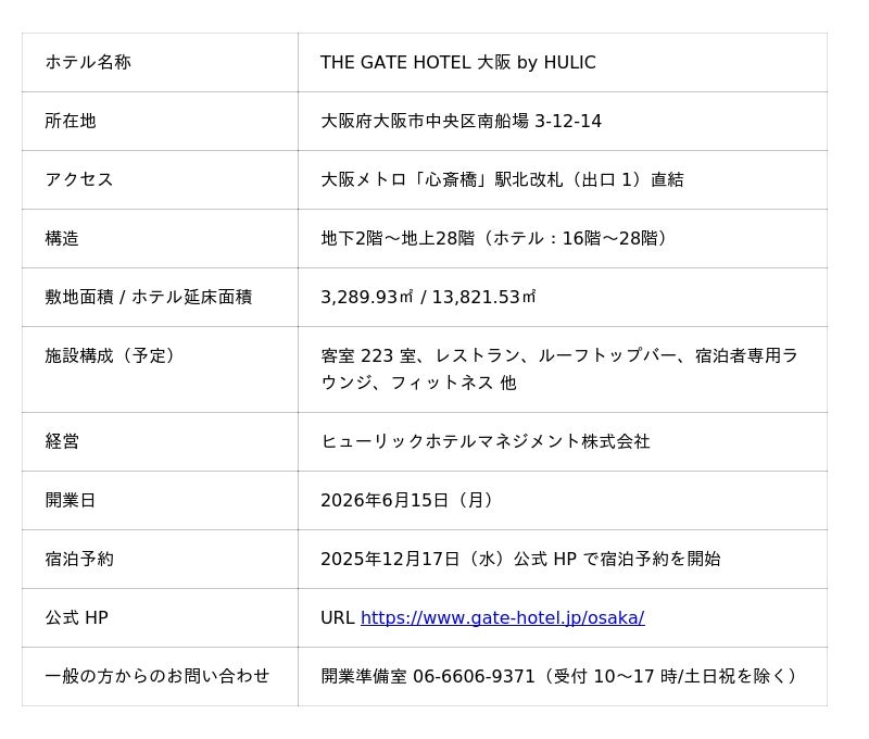 ヒューリックホテルマネジメント株式会社(所在地:東京都中央区日本橋小舟町13-8)は、2026年6月15日(月)に、ザ・ゲートホテルブランドとして国内8軒目となる関西エリア旗艦店「ザ・ゲートホテル大阪 by HULIC」(所在地:大阪府大阪市中央区南船場 3-12-14)を開業いたします。