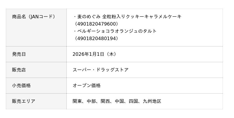敷島製パン株式会社(Pasco)は、「満たされプラススイーツ」シリーズであり、「麦のめぐみ」シリーズでもある新商品「麦のめぐみ 全粒粉入りクッキーキャラメルケーキ」を、2026年1月1日(木)より関東、中部、関西、中国、四国、九州地区にて発売します。