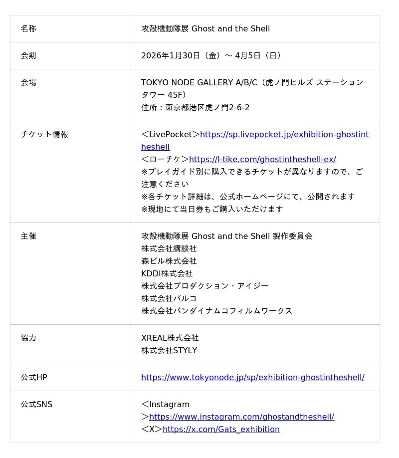 攻殻機動隊展 Ghost and the Shell 製作委員会(株式会社講談社、森ビル株式会社、KDDI株式会社、株式会社プロダクション・アイジー、株式会社パルコ、株式会社バンダイナムコフィルムワークス)は、2026年1月30日(金)から4月5日(日)まで、虎ノ門ヒルズの情報発信拠点「TOKYO NODE(東京ノード)」にて開催する『攻殻機動隊展 Ghost and the Shell』にて販売する本展オリジナル公式グッズ 第一弾(55点)を公開いたしました。