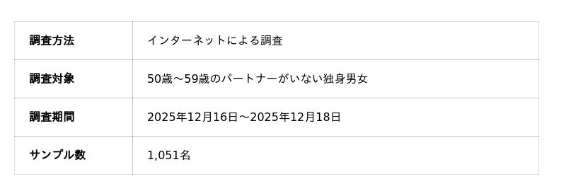 50歳以上限定のマッチングアプリ「Goens(ゴエンズ)」(運営:Goens株式会社/本社:愛知県名古屋市/CEO : 廣澤 和也)は、こうした50代特有の孤独や恋愛観の実態を明らかにするため、パートナーがいない全国の50代独身男女を対象に意識調査を実施しました。