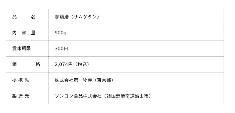 本品は、韓国の生活協同組合であるドゥレ生協オリジナルの食品です。ドゥレ生協は生活クラブと同じように食の安心・安全を追求している生協であり、本品も抗菌生物質を一切使わずに飼育した鶏をまるごと一羽使用しています。また、有機栽培のもち米、にんにく、ナツメ、高麗人参などを詰めて長時間煮込んでいるため、お肉がホロホロとほぐれるほどしっとり柔らかく仕上がっています。味付けは少量の食塩のみなので、シンプルながらも鶏の旨みがしっかり感じられる滋味深い味わいです。お好みで塩・コショウ、ねぎ、またはキムチなどを加えてお召し上がりください。1袋900g入りなので2~3人で分けられる十分なボリューム感があり、調理済みレトルト品のため、ドゥレ生協の組合員が普段から食べている味をそのままに、手軽に参鶏湯を食卓で楽しむことができます。また湯せんや電子レンジ調理のほか、鍋に移して温めるとスープが煮詰まって、よりコクが増しおいしく食べられます。