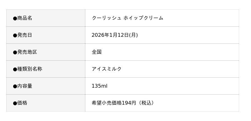 株式会社ロッテ(東京都新宿区、代表取締役社長執行役員:中島英樹)は1月12日(月)に、“飲むアイス”の「クーリッシュ」ブランドから、『クーリッシュ ホイップクリーム』を発売します。誰もが一度は夢見た(?)「まるでホイップクリームを直飲み!?」という疑似体験ができる、新作クーリッシュです。ホイップクリームらしいミルク感のある味わいを目指して、乳脂肪分を4.3%配合した「アイスミルク」グレードに仕立てました。ホイップクリームらしい甘さを、微細氷で後味スッキリ最後まで飽きずに飲み切れる、冬の家中シーンにピッタリな味わいです。「クーリッシュ」公式SNSでは“本当にこんな商品あったらいいな”を「#妄想パッケージ」として発信しており、『クーリッシュ ホイップクリーム』は過去投稿した「#妄想パッケージ」の中でもフォロワーから反響の大きかったパッケージのひとつで、今回“妄想”が現実となる形で商品化を果たしました。まるで本物のホイップクリームを飲んでいるような、「禁断の味」をぜひお楽しみください。