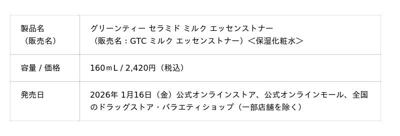 アモーレパシフィックジャパン株式会社(本社:東京都渋谷区)が展開する、自然主義アクティブスキンケアブランド [INNISFREE | イニスフリー] は、“とろみがありながら、角質層まで潤いが素早く浸透する”と口コミを中心に高い評価を得ている化粧水『グリーンティー セラミド ミルク エッセンストナー』を、2026年1月16日(金)より順次全国発売いたします。