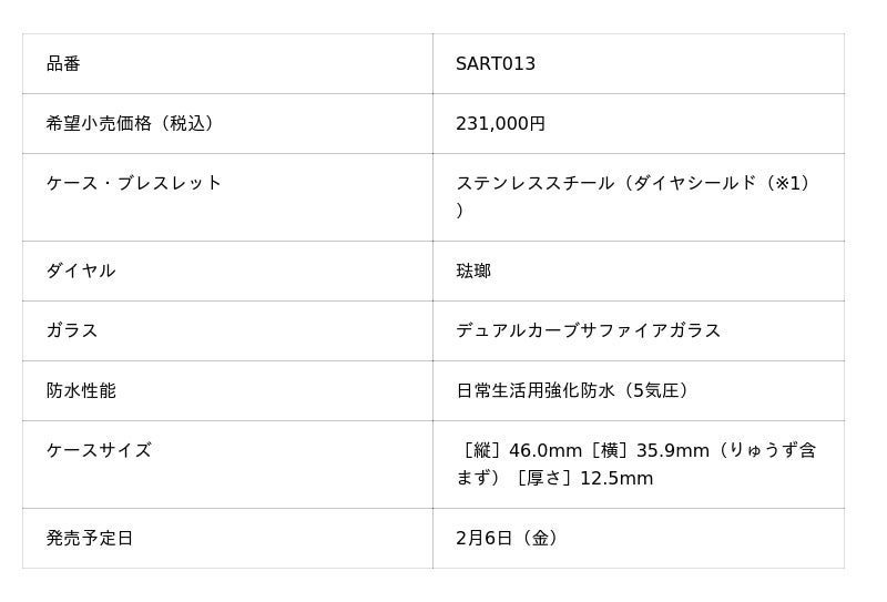 セイコーウオッチ株式会社(代表取締役会長 兼 CEO 兼 CCO:服部 真二、本社:東京都中央区)は、<セイコー プレザージュ>クラシックシリーズより、伝統工芸の「琺瑯(ほうろう)」で作られたダイヤルを採用したトノー型のレギュラーモデルを2月6日(金)に発売いたします。希望小売価格は231,000円(税込)です。