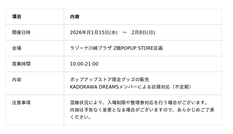 KADOKAWA DREAMS ポップアップストア in ラゾーナ川崎 開催決定