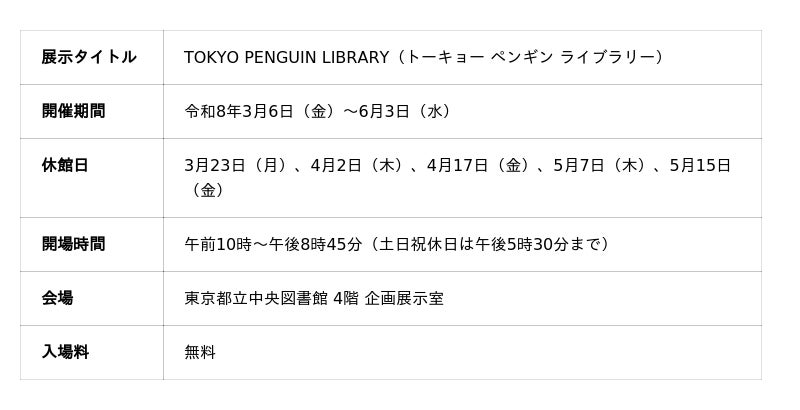 東京都立中央図書館企画展示「TOKYO PENGUIN LIBRARY(トーキョー ペンギン ライブラリー)」開催のお知らせ