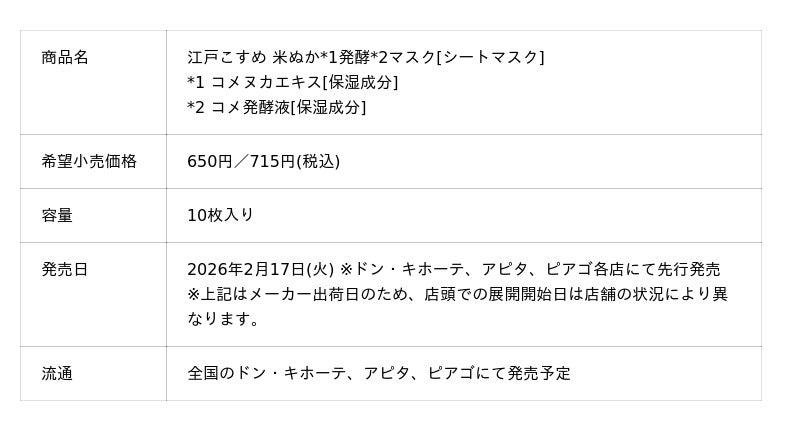ロゼット株式会社(本社:東京都品川区、代表取締役社長:藤井 敬二)は、米ぬかでキメを整えるスキンケアブランド『江戸こすめ』から、毛穴と透明感*3にアプローチする「江戸こすめ 米ぬか*1発酵*2マスク」を、2026年2月17日(火)よりドン・キホーテ、アピタ、ピアゴ各店にて先行発売いたします。
