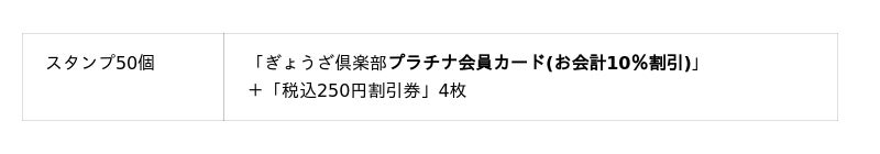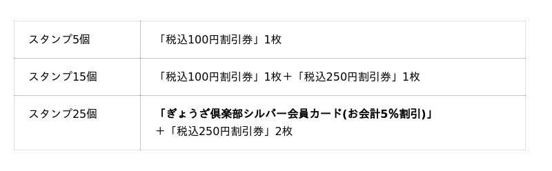 スタンプを集めると、各種割引券や、お会計が毎回最大10%割引になる「ぎょうざ倶楽部会員カード」と交換できます。