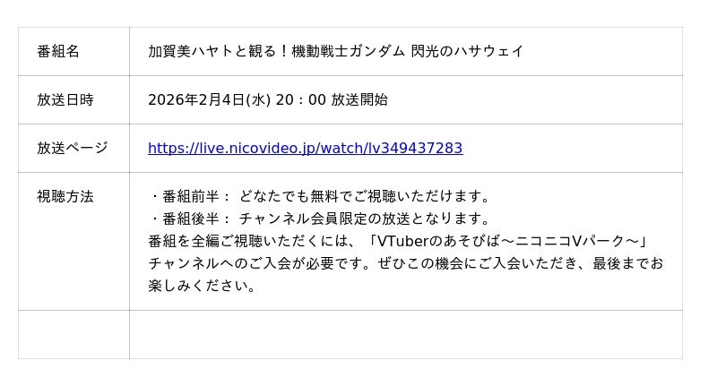 株式会社ドワンゴが運営するニコニコ公式チャンネル「VTuberのあそびば~ニコニコVパーク~」の人気生放送番組「VTuberと観る!映画実況シリーズ」にて、にじさんじ所属のVTuber・加賀美ハヤトが、劇場アニメ3部作の第1作品目『機動戦士ガンダム 閃光のハサウェイ』を実況生放送することが決定いたしました。